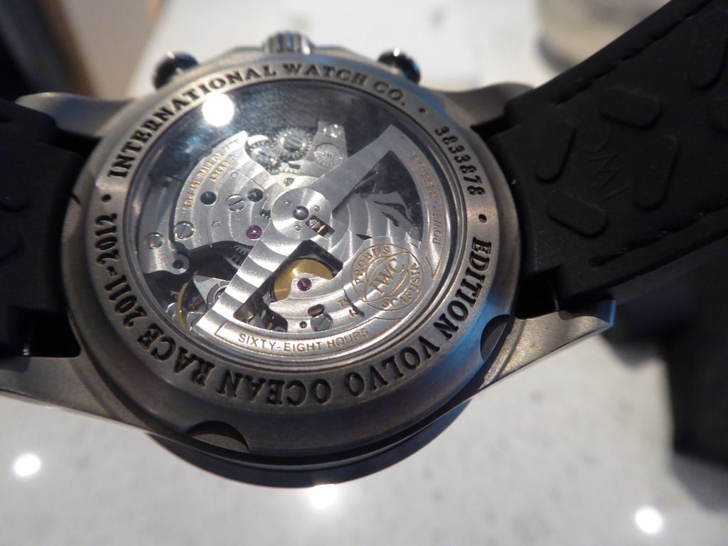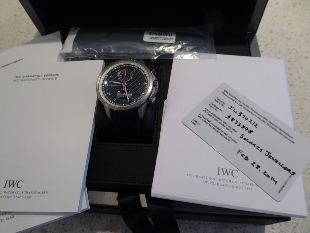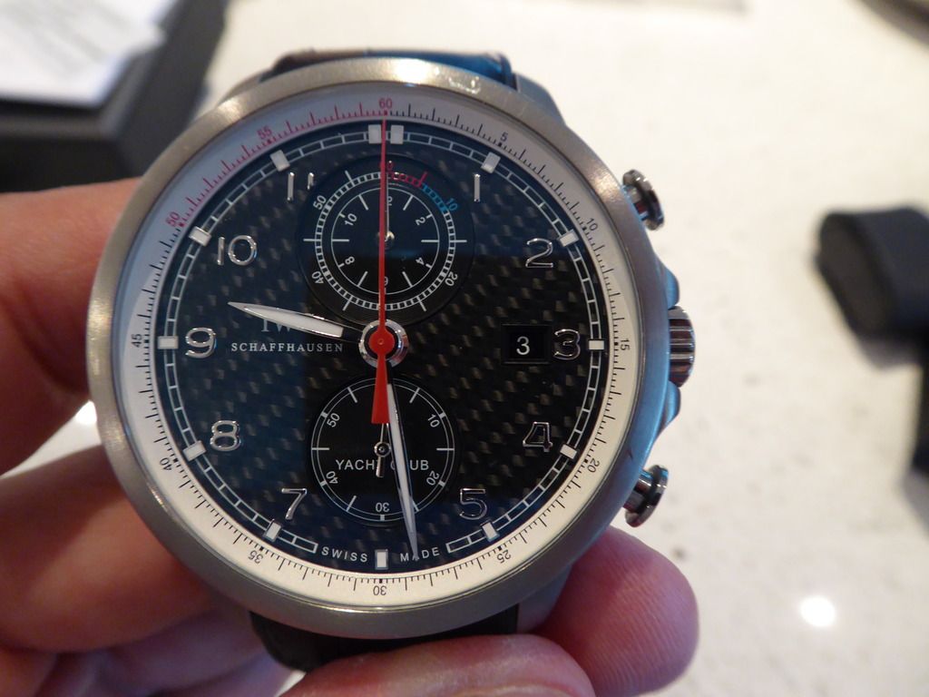 I am selling my limited edition Portuguese Yacht Club Chrono, the Volvo Ocean Racer. This timepiece has a titanium case and the beautiful carbon fibre dial that was only made for this Volvo Ocean racer edition. The watch comes from a Canadian AD, comes complete with outer brown cardboard box, limited edition black inner box, all papers etc and an extra OEM leather strap with rubber backing as well as the OEM rubber strap that came with the watch, both straps on the titanium deployant buckle. The watch is mint with a few minor smudges on the bezel that could be polished out or rubbed out with a cap cod cloth. The watch and I are located in Toronto but I will ship anywhere in Canada and can meet in Toronto for a face to face sale.