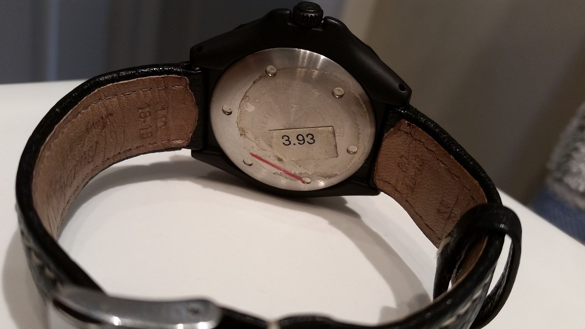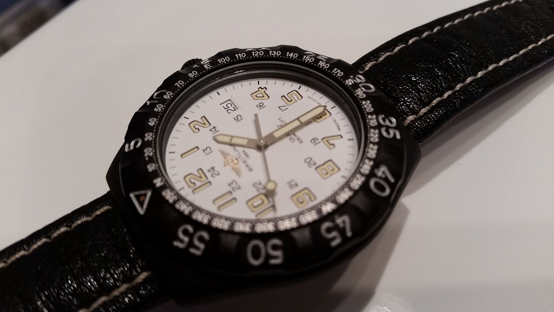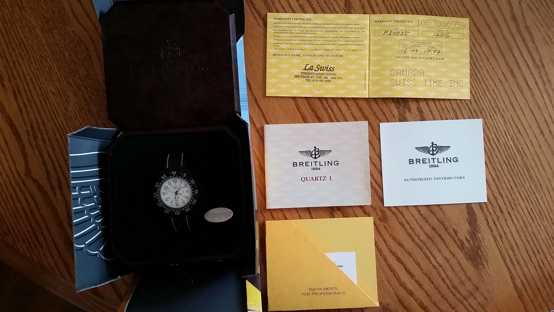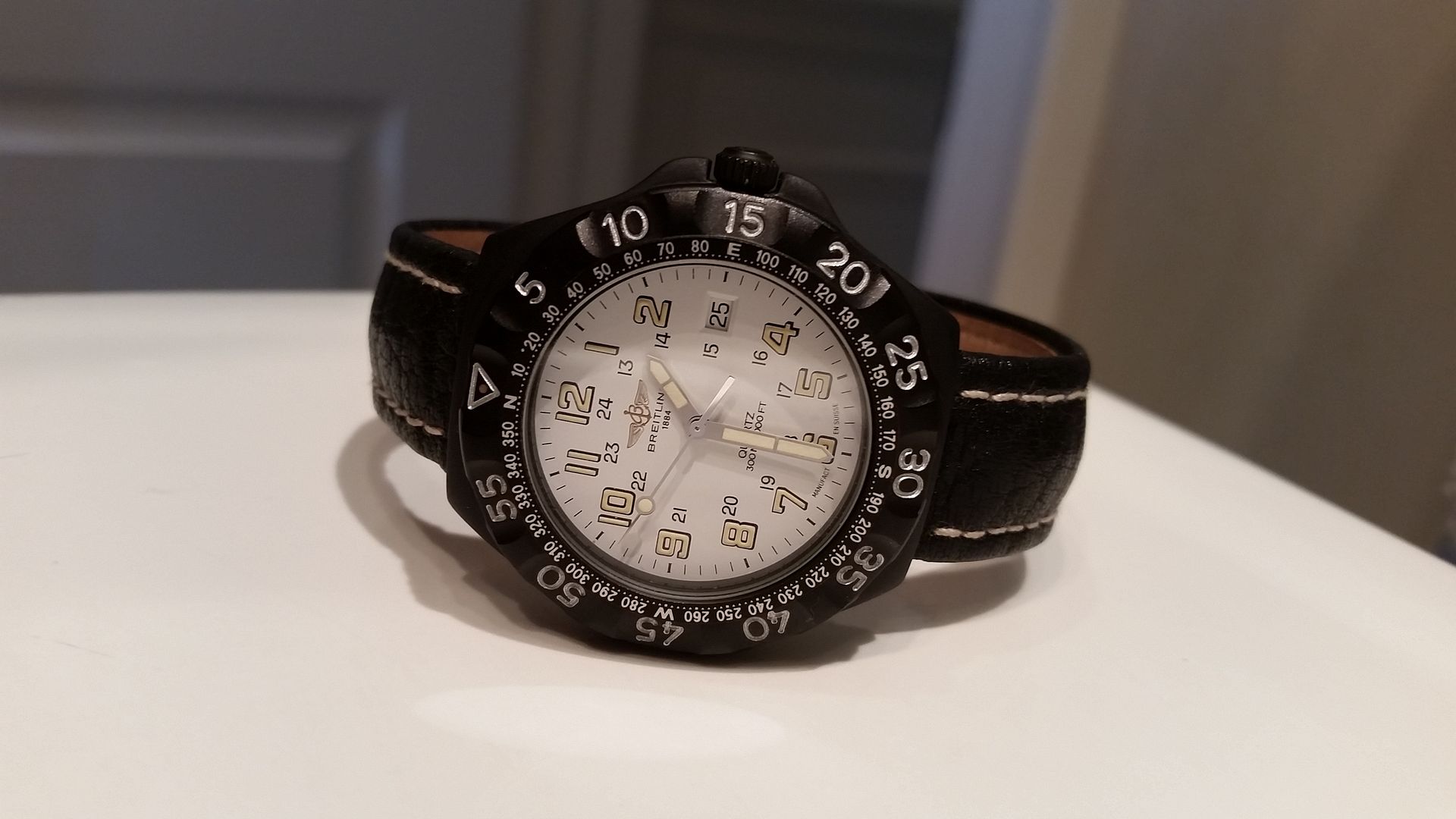 Up for Sale is my personal and 100% Authentic Breitling Colt quartz Military PVD watch from the 90's. This watch is a true safe queen. 95%+ condition. Purchased in September 1997, the watch hasn't been worn. PVD coating is all intact, no blemishes at all. If you are lookin g b for this military model, you won't be able to find a better version than this. Comes mounted on a genuine Breitling 18mm Calfskin strap with Breitling tang buckle. Model number is M50035. Sticker is still on case back.