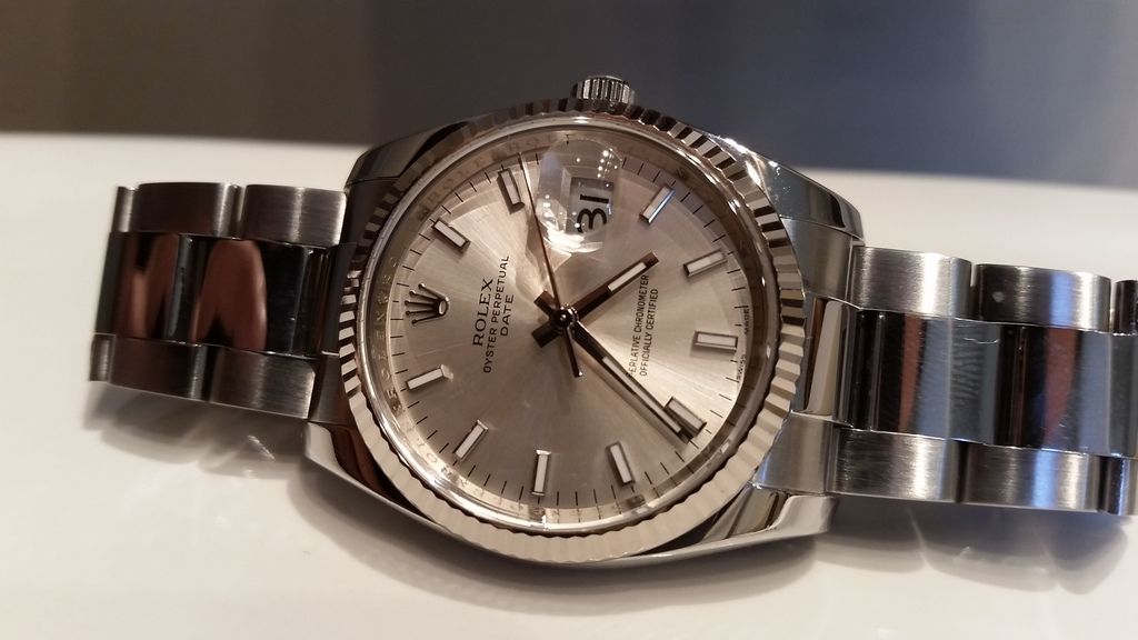 This is the men's 34mm watch. It is an M serial which dates it back to 2008. This is the newer version of the Date with wider lugs, polished case, Rolex Rehaut around inner bezel along with serial number engraved, newer solid oyster bracelet. A true beauty.