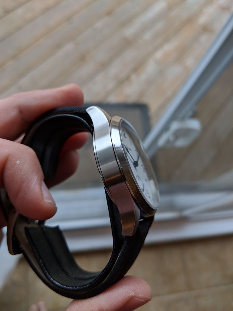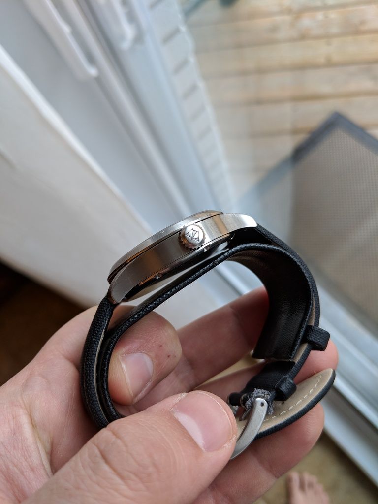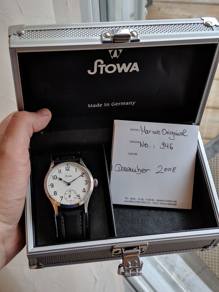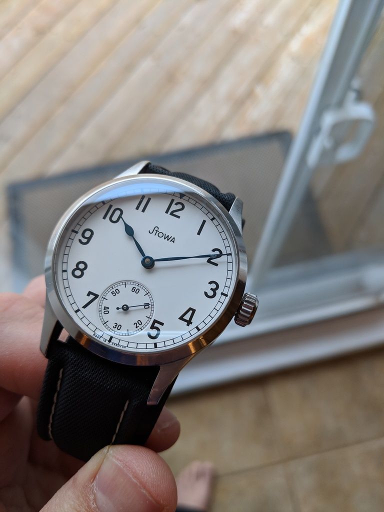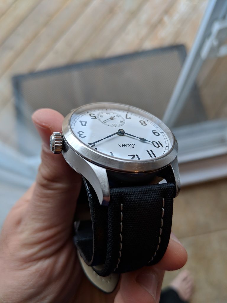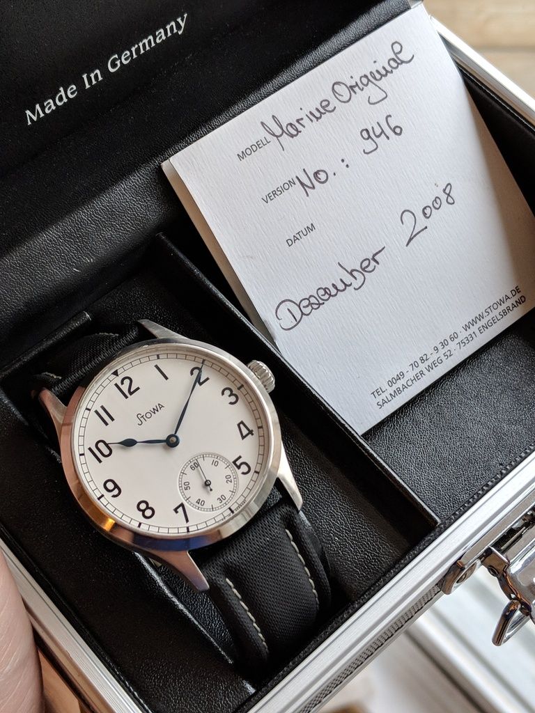 Comes on a cheapie strap that looks decent. The original one was worn out a long time ago. Original metal Stowa stamped buckle is included, and can be put on any 22mm strap you choose later on.