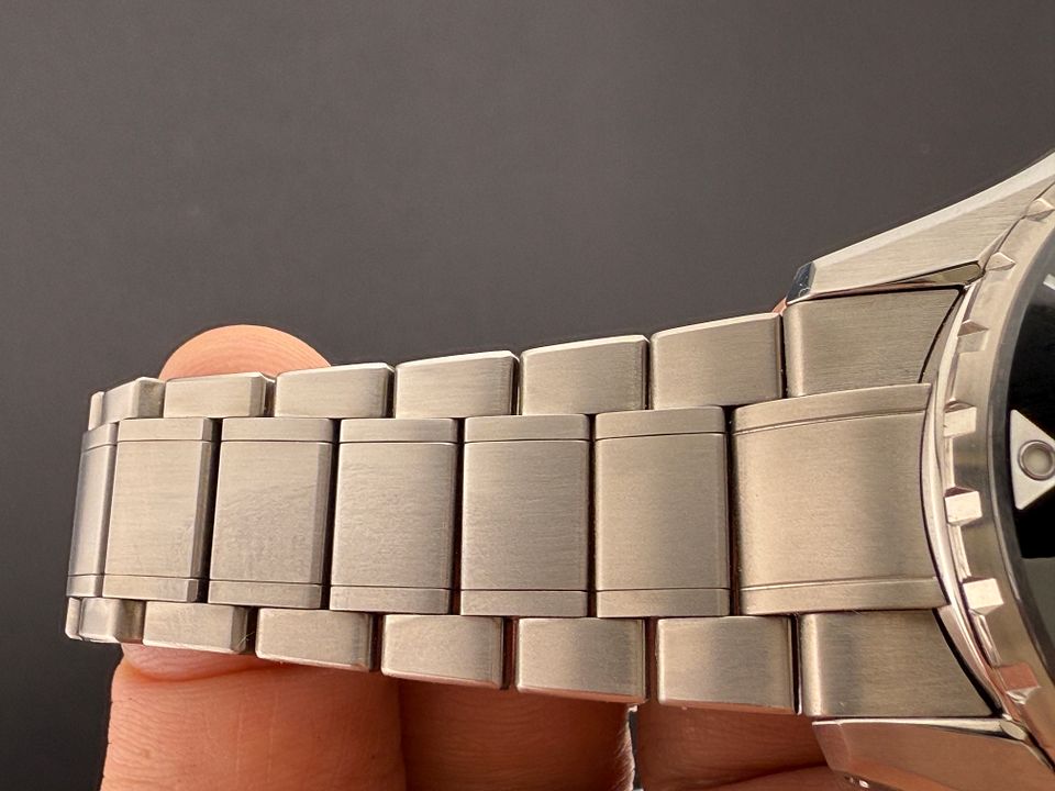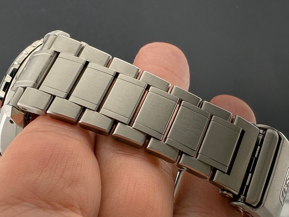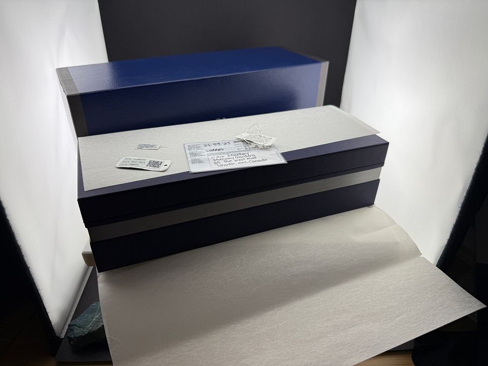 Included with watch: Original boxes (2 total: White sleeve and blue outer box, inner blue watch box), manuals, hang tabs, extra links, and AD filled in warranty card,.