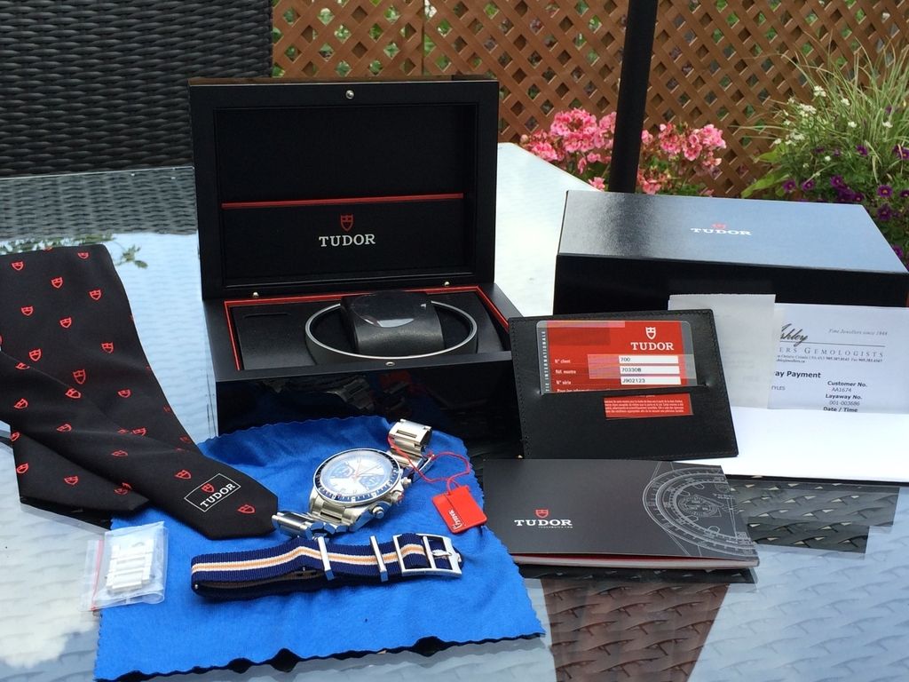 The sale includes everything you would expect a 'full kit' to include; the watch, steel bracelet, blue / orange strap, all manuals and papers, warranty card, inner hard shell box, outer box, hang tag, extra links. I am also including the Tudor neck tie that I was given by the AD as part of the purchase. All parts of the kit ie inner box, outer box, papers and manuals etc... are in mint condition, no damage.